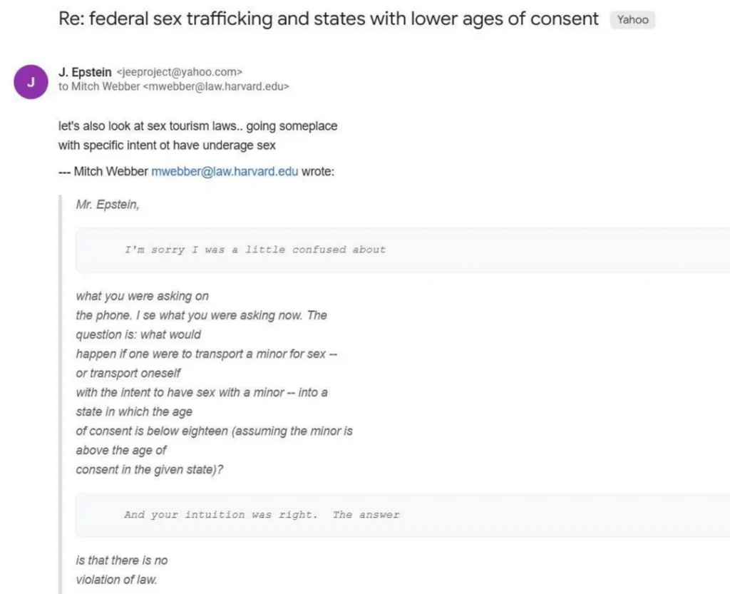 Avalikustatud e-kirjadest selgub, et Webber pidas 2006. aastal Epsteiniga kirjavahetust küsimustes, mis puudutasid alaealiste osariikidevahelist transporti seksuaalse ärakasutamise eesmärgil ning vanusepiiranguid käsitlevaid õiguslikke lünki.