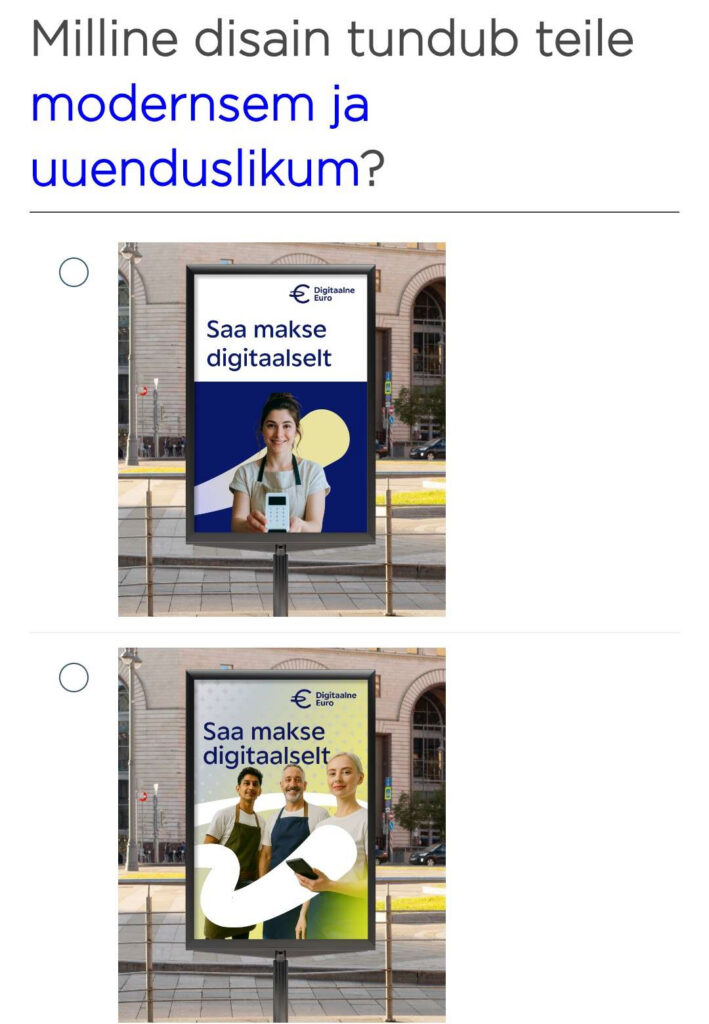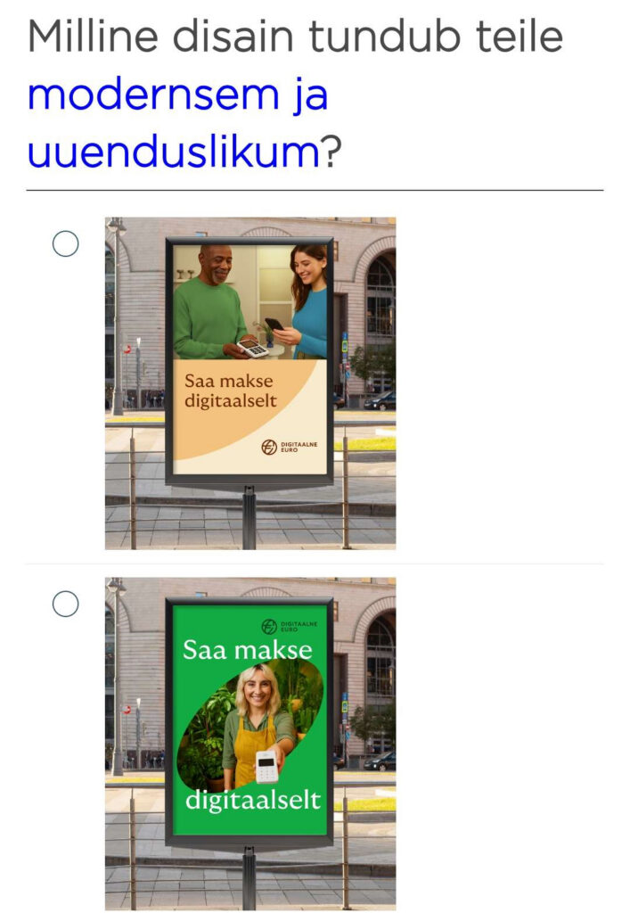 Osalejatelt palutakse valida, milline digieuro logo tundub “tugev ja stabiilne” ning milline “kaasav ja ligipääsetav”. Järgnevad visuaalsed kampaanialahendused, mida hinnati omadussõnadega nagu “võimestav”, “kindlameelne” või “usaldust tekitav”.